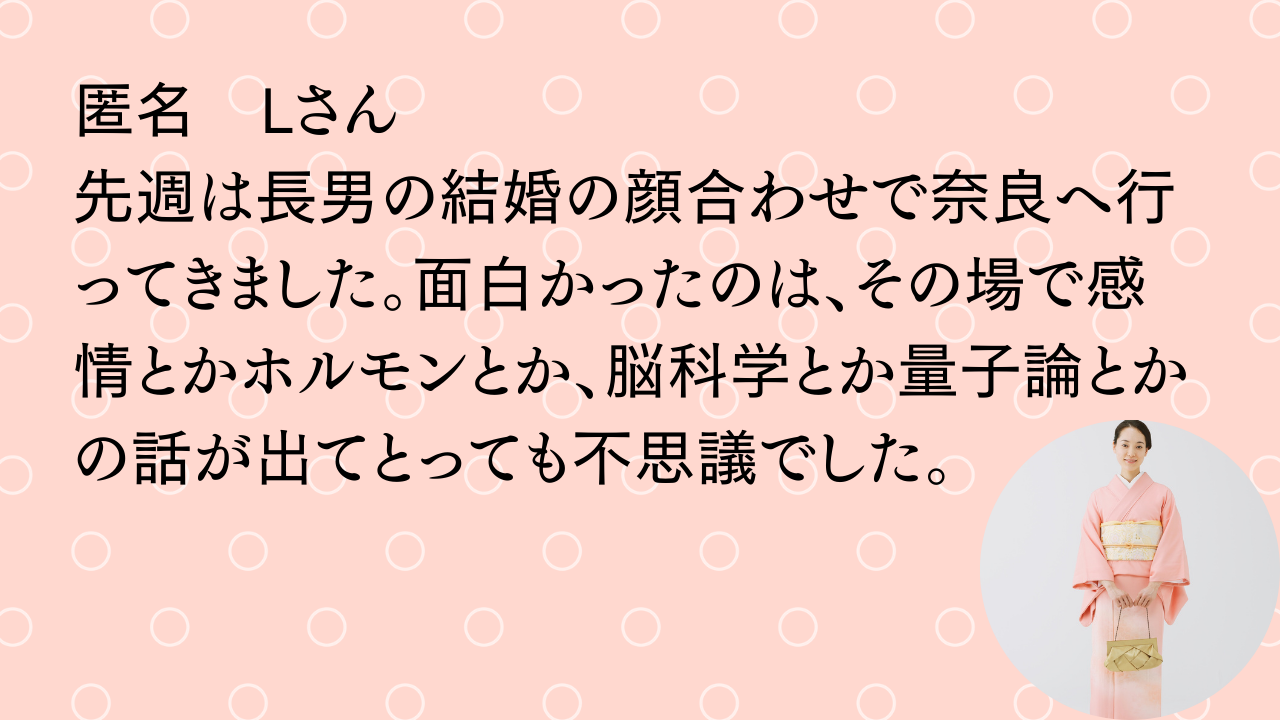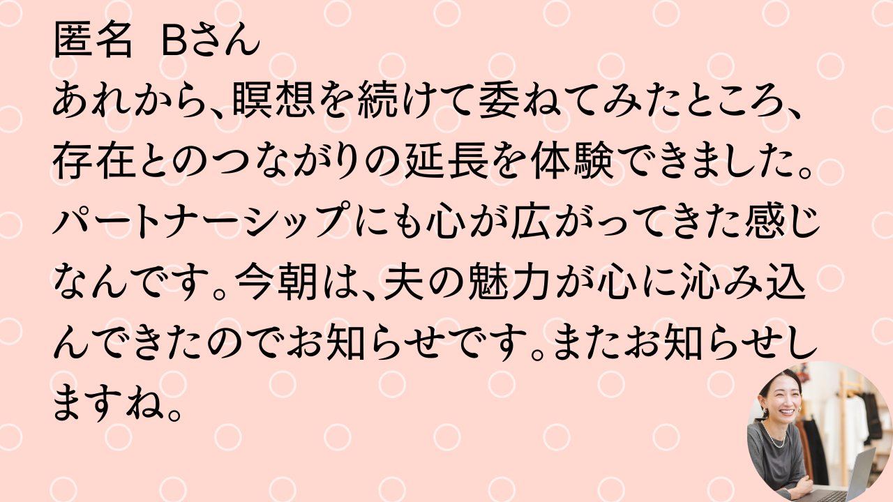 心の変化は、パートナーとの関係や状況の変化として日々実感できます。あなたの大切な方と分かち合ってください。