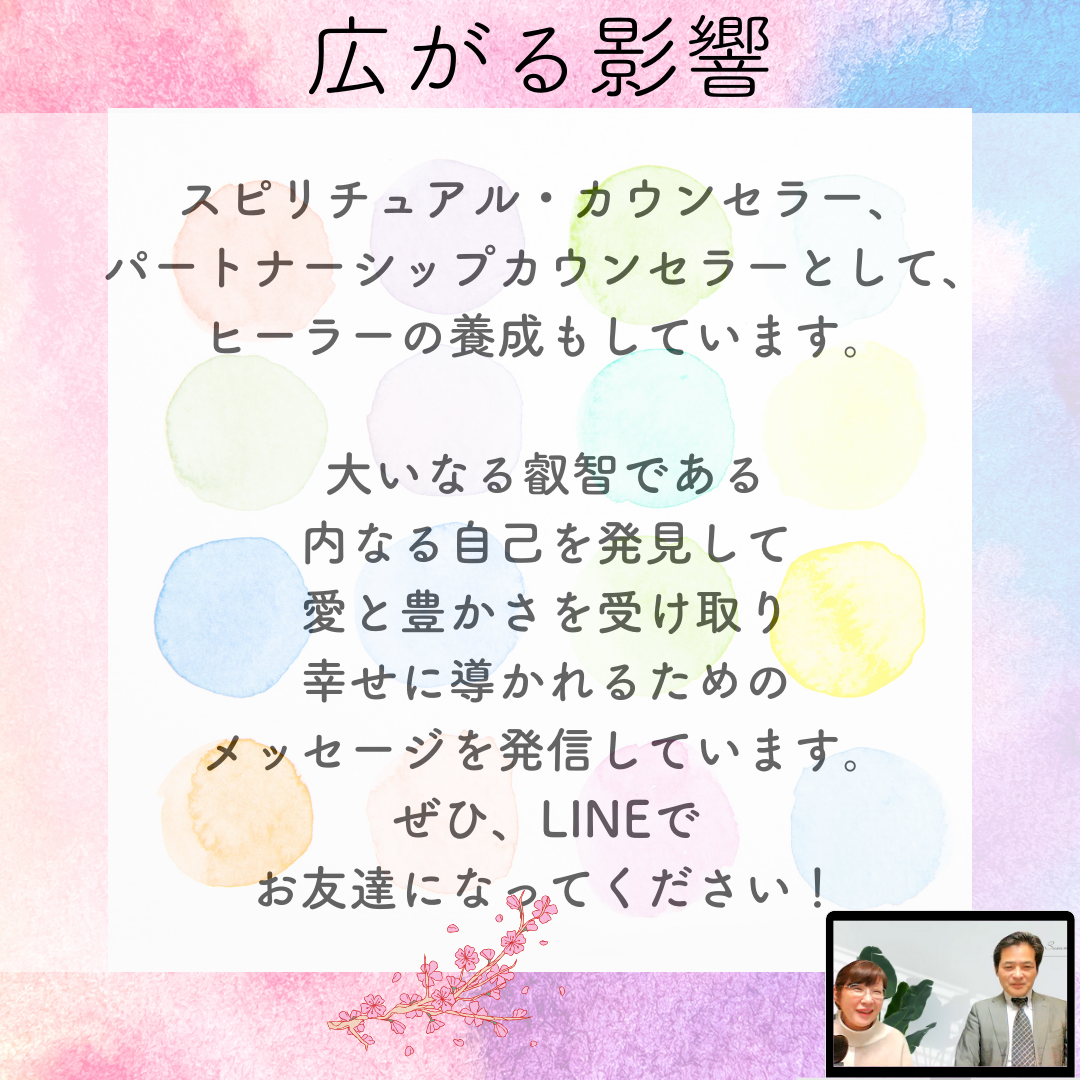 私たち夫婦の使命は、宇宙の法則である大いなる叡智と繋がりながら人々の変化の過程を後押しして、心の平和と身体の調和をもたらすことです。