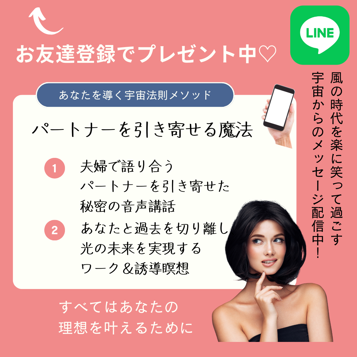 お友達になってくれた特典では、理想のパートナーと出会ったその秘訣を夫婦で語り合っていますので聞いていただけたら、それはパートナーだけではなく叶えたい願望を叶える秘訣でもあるので、パートナーがいる方にも役立つかなと思います。